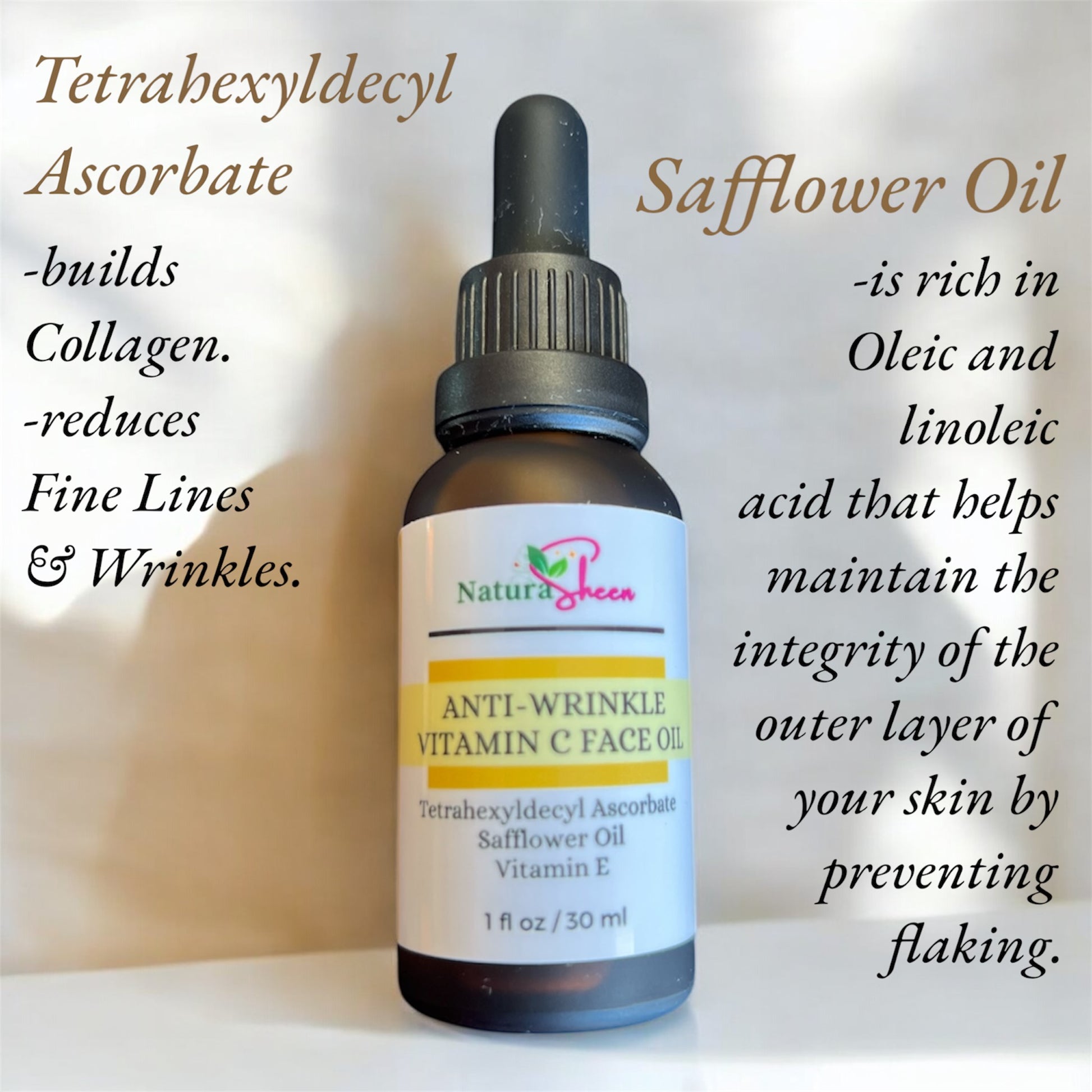 Anti-Wrinkle Vitamin C Face Oil. Tetrahexyldecyl Ascorbate THDA Vitamin C Face Oil with Vitamin E, Safflower Oil, and Licorice Extract. Fragrance Free. No preservatives or artificial dyes. Brightening Radiant Hydrate Moisturize