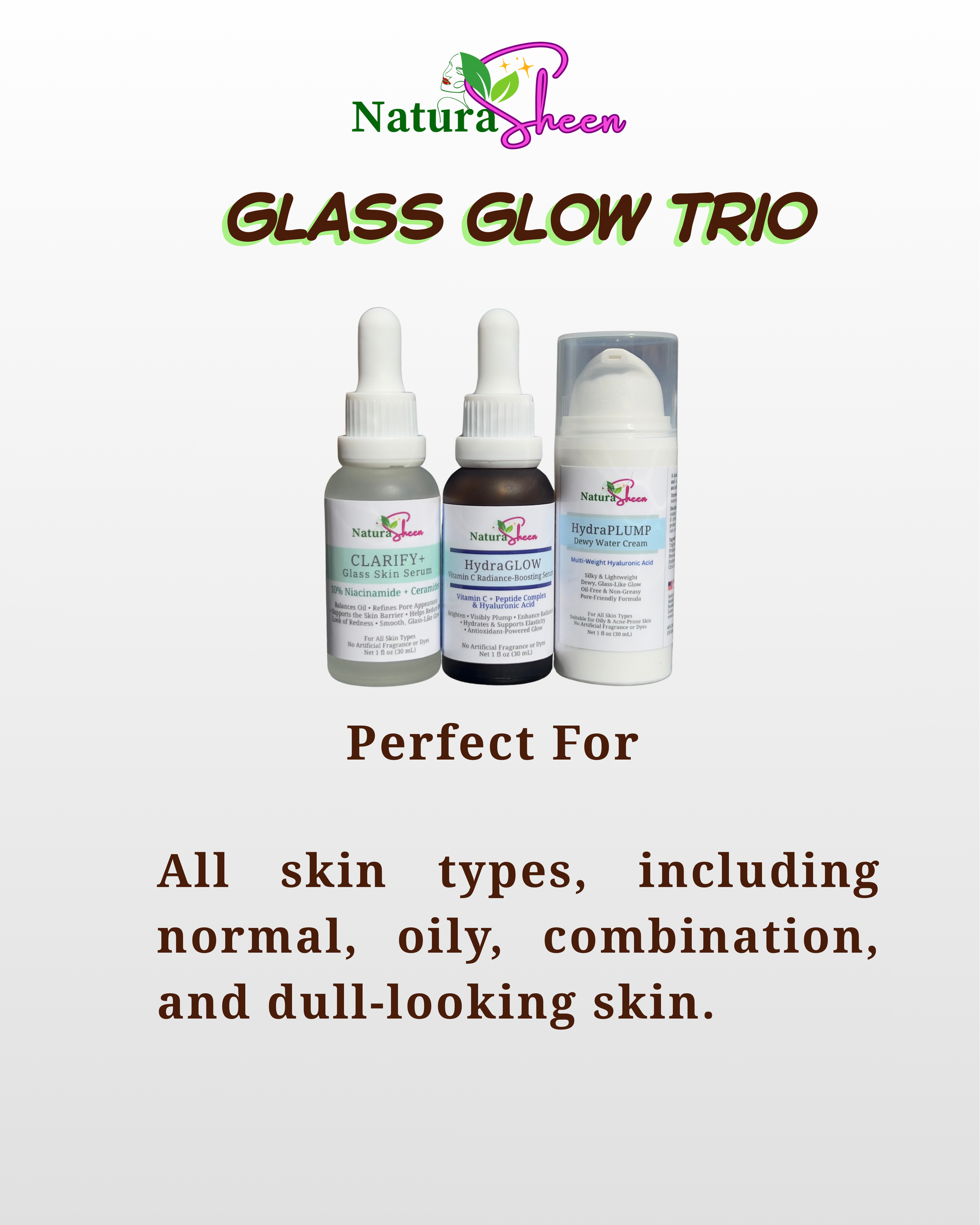 The NaturaSheen Glow Trio is your simple, effective routine for achieving smoother, hydrated, and radiant-looking skin—without the need for complicated steps.
