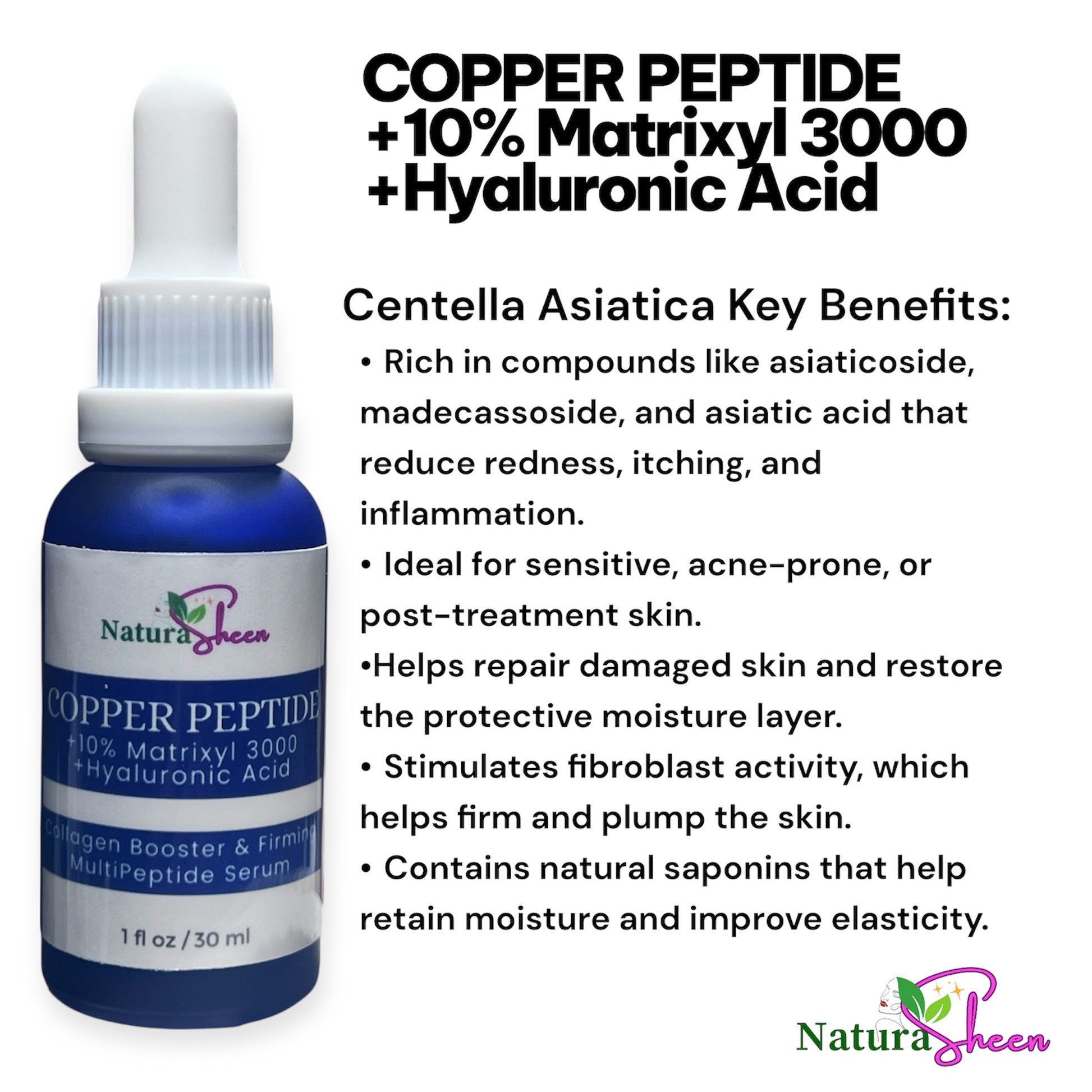 A science-backed rejuvenating serum powered by Copper Peptide, 10% Matrixyl 3000, Hyaluronic Acid, and Centella Asiatica — a potent blend that helps repair, hydrate, and renew tired, aging, or stressed skin.